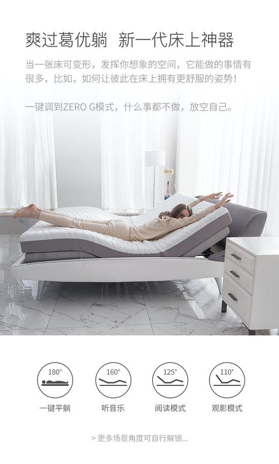 ¡¡¡¡ÖÇÄܵ綯´²µÄ´²Í·´²Î²¿Éͨ¹ýÒ£¿ØÆ÷»òÊÖ»úapp¿ØÖÆÉý½µ£¬×éºÏ³ö¶àÖÖ×ËÊÆÆ¥ÅäÖÚ¶àÉú»î³¡¾°£¬Ò»¿î¡°´ÏÃ÷¡±µÄ´²£¬Äܶ®ÄãËùÐè¡£Æô¶¯µç¶¯¼ÇÒäģʽ£¬Ò»¼ü¡°¸ðÓÅÌÉ¡±ÕÒµ½×Ô¼ºÉ趨µÄ×î¼Ñ×ËÊÆ£»ÔÚ¶ÁÊ顢ˢÊÖ»úģʽÏ£¬ÐÜèÌåÓýÖйúÖÇÄÜ´²Äܵ÷ÕûÖÁ±³¿¿125¡ã¶ÈµÄ×î¼ÑÊӽǣ¬Èþ±×µµÃµ½×îÓÐÀûµÄÖ§³Å£»ÔÚ¹ÛӰģʽÏ£¬´²Ìå±³¿¿Ì§Éý110¡ã¶È£¬ÍȲ¿Ì§¸ß20¶È£¬Ê¹Óû§ÔÚÈáÈíÊæÊÊÖзÅËÉ×·¾ç£¬ÏíÊÜÊôÓÚ×Ô¼ºµÄ¡°Ë½ÈËÓ°Ôº¡±£»ÔÚ¸öÐÔģʽÏ£¬×ö¸ö¡°Ð¡Ñà·É¡±£¬ÊæÕ¹ÉíÐÄ»º½âÒ»ÌìµÄ¼¹×µÑü׵ƣÀÍ£»Êʵ±µ÷Õû´²Í·½Ç¶È£¬Ê¹Ôи¾¡¢ÀÏÈ˵ÈÌØÊâÈËȺÆðÎÔ³ÅÑü¡¡